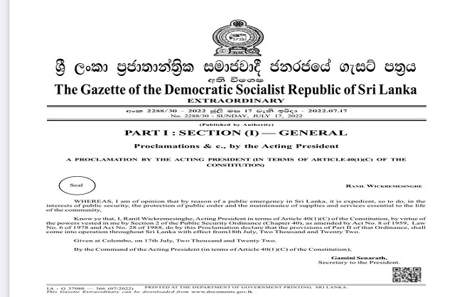 आदेश में कहा गया है कि आर्थिक संकट को देखते हुए कानून व्यवस्था और आवश्यक वस्तुओं की सुचारू आपूर्ति के लिए 18 जुलाई से आपातकाल लगाया जा रहा है।