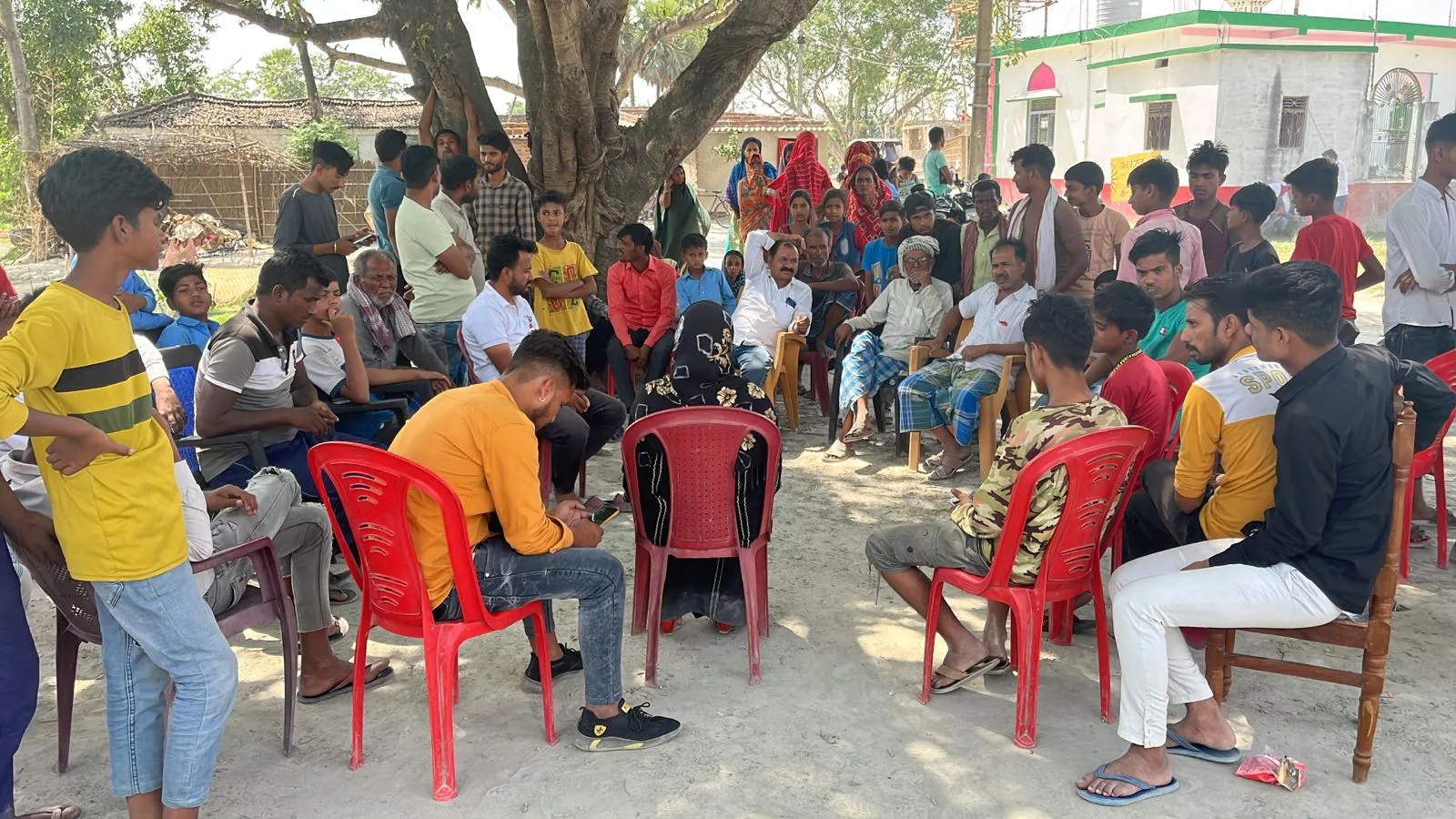 तुरकौलिया पहुंचने के बाद छात्रा अपने पति के दरवाजे के बाहर दर्जनों ग्रामीणों के साथ बैठी है| जब पति को दरवाजा खोलने को कहा जा रहा है, तो पति उसके दरवाजा खोलने से इंकार कर रहे हैं।