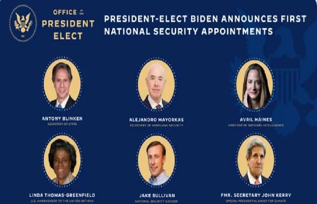वाशिंगटन। अमेरिका के नवनिर्वाचित राष्ट्रपति जो बाइडेन ने मंगलवार को अपनी नई कैबिनेट की घोषणा कर दी। बाइडेन की नई कैबिनेट में लिंडा थॉमस को संयुक्त राष्ट्र में अमेरिका की राजदूत बनाया गया है। जेक सुलिवान को राष्ट्रीय सुरक्षा सलाहकार (एनएसए) की जिम्मेदारी सौंपी गई है जबकि एंटनी ब्लिंकेन को विदेश मंत्री बनाया गया है। कैबिनेट में शामिल किये गए सभी 6 लोगों को राष्ट्रपति ओबामा और उस समय के उप राष्ट्रपति जो बाइडेन के साथ कार्य करने का अनुभव है।