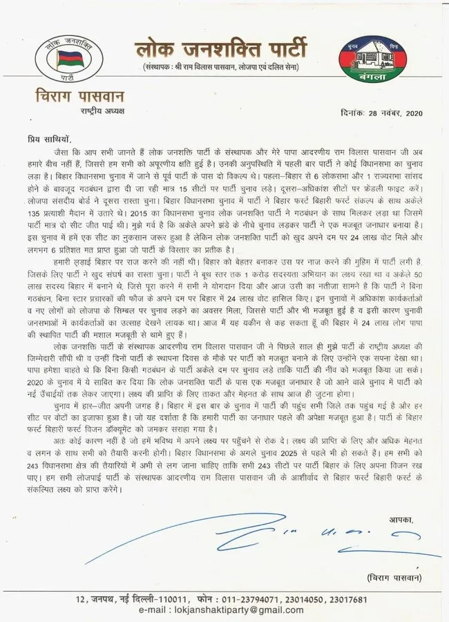 शनिवार को लोजपा अध्यक्ष व जमुई सांसद पासवान ने पत्र में लिखा है कि पापा (रामविलास पासवान) अब हमारे बीच नहीं हैं, जिससे हम सभी को अपूरणीय क्षति हुई है। बिहार विधानसभा चुनाव में पार्टी को 24 लाख वोट और लगभग 6 प्रतिशत मत अकेले प्राप्त हुए हैं, जो लोजपा के विस्तार को साफ दिखाता है। बिहार में पार्टी ने बिहार फर्स्ट बिहारी फर्स्ट के साथ कोई समझौता नहीं किया। उन्होंने लिखा है कि बिहार विधानसभा चुनाव में जाने से पूर्व पार्टी के पास दो विकल्प थे। पहला, बिहार से छह लोकसभा और एक राज्यसभा सांसद होने के बावजूद गठबंधन द्वारा दी जा रही मात्र 15 सीटों पर चुनाव लड़े। दूसरा, अधिकांश सीटों पर फ्रेंडली फाइट करें। लोजपा संसदीय बोर्ड ने दूसरा रास्ता चुना औऱ बिहार विधानसभा चुनाव में पार्टी ने बिहार फर्स्ट बिहारी फर्स्ट संकल्प के साथ अकेले 135 प्रत्याशी मैदान में उतारे थे।