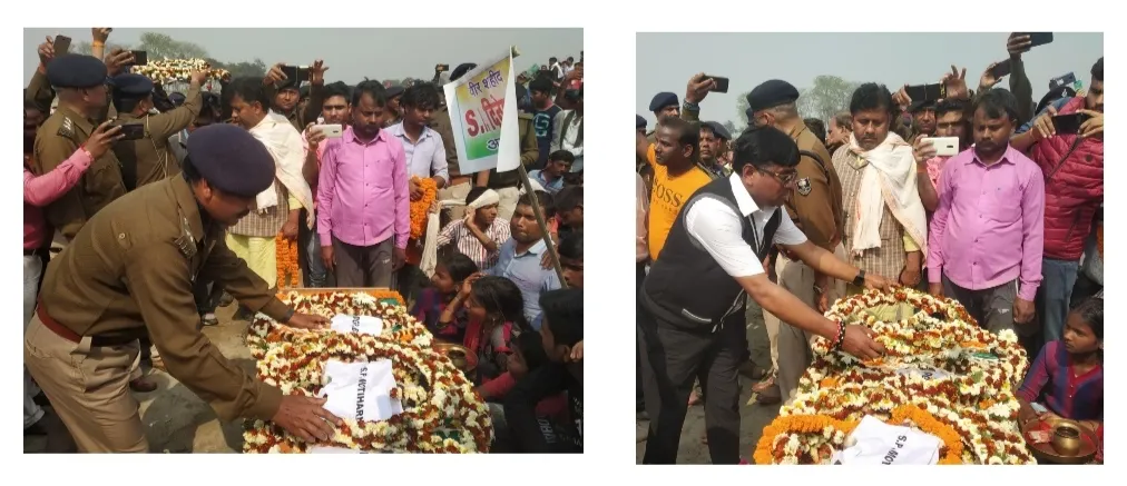 मोतिहारी। पूर्वी चम्पारण जिला के लखौरा थाना क्षेत्र के सरसौला गांव में शहीद सब इंस्पेक्टर दिनेश राम को राजकीय सम्मान के साथ गुरुवार को श्रद्धांजलि देने पहुंचे उप विकास आयुक्त सह प्रभारी जिलाधिकारी कमलेश कुमार सिंह एवं पुलिस अधीक्षक नवीन चन्द्र झा।