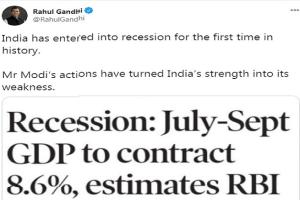नई दिल्ली। देश के आर्थिक स्थिति को लेकर कांग्रेस के पूर्व अध्यक्ष राहुल गांधी ने एक बार फिर प्रधानमंत्री नरेन्द्र मोदी पर हमला बोला है। उन्होंने गुरुवार को ट्वीट कर कहा कि इतिहास में पहली बार भारत आर्थिक मंदी की चपेट में आया है। यह सब प्रधानमंत्री नरेन्द्र मोदी के गलत फैसलों का नतीजा है, जिसने […] सोनिया-राहुल के इशारे पर हुई अर्नब की गिरफ्तारी, देश नहीं करेगा उन्हें माफ : नड्डा